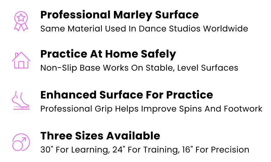 Our Dancing Disc comes in 3 sizes to match every dancer’s needs. The 30” offers studio-style space and comfort, the 24” balances portability with room for turns, and the 16” is ultra-portable and perfect for mastering precise spins anywhere.
